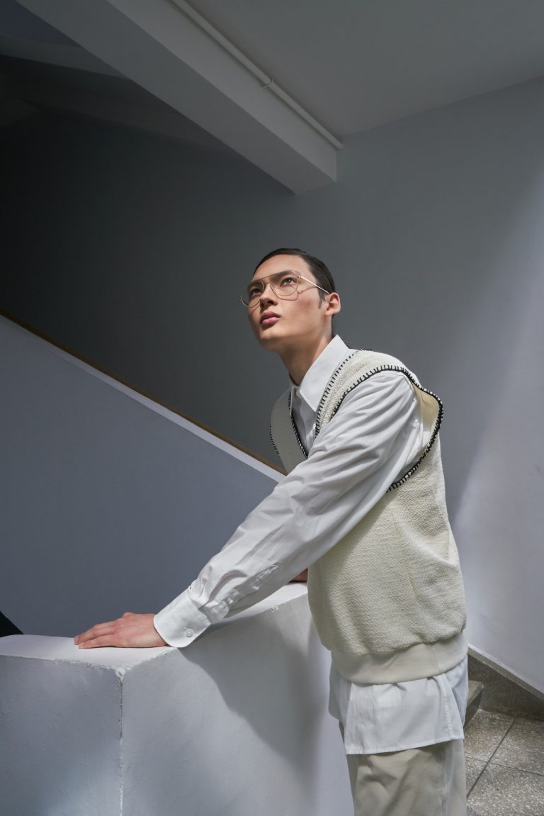 Khi thời tiết trở nên mát mẻ hoặc lạnh dần thì áo mơ mi có thể được thay thế bởi một chiếc áo len cổ trụ sẫm màu bên dưới chiếc áo vest . Và đừng quên hoàn thiện outfit với một đôi giày thể thao màu trắng.