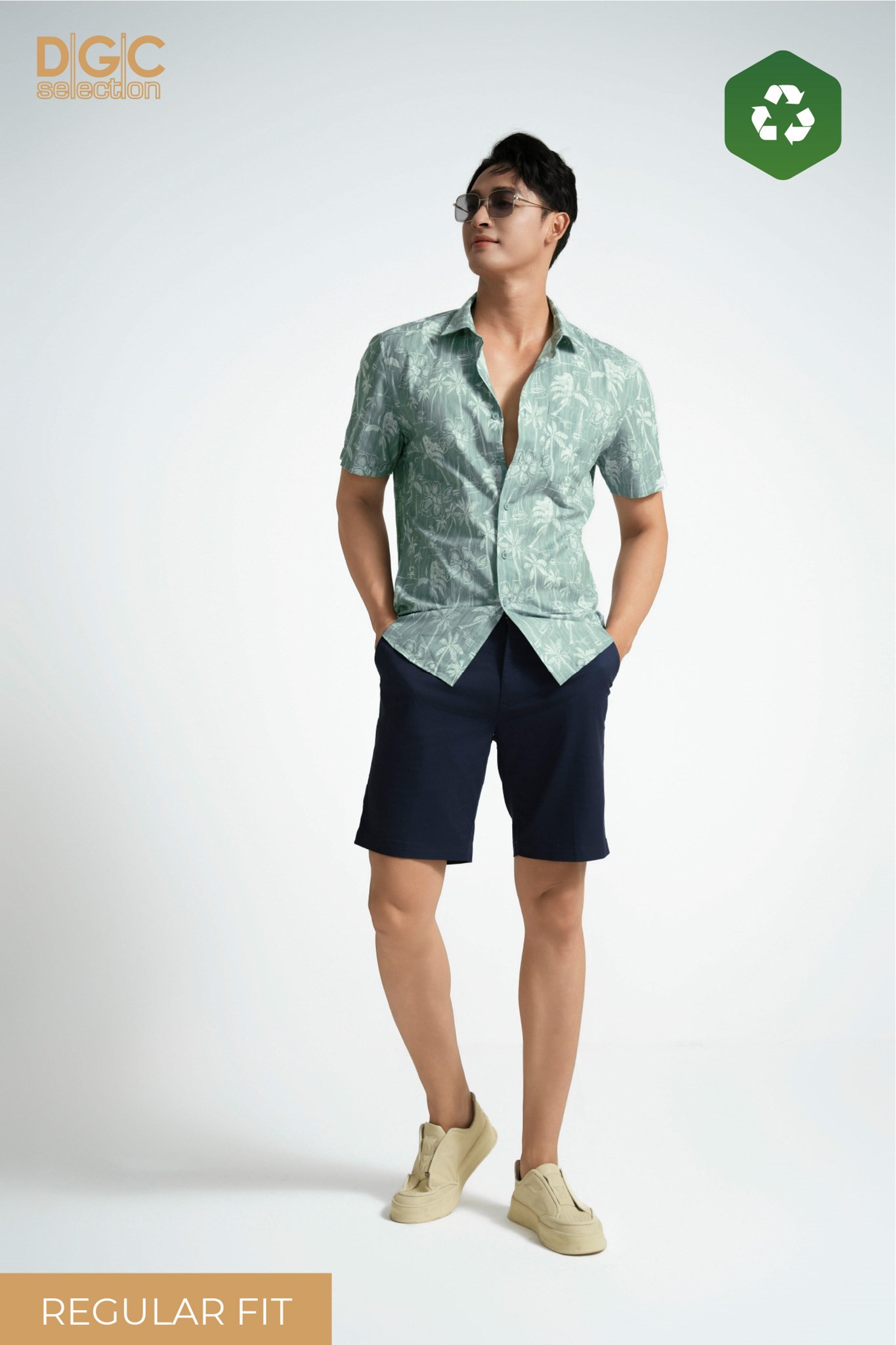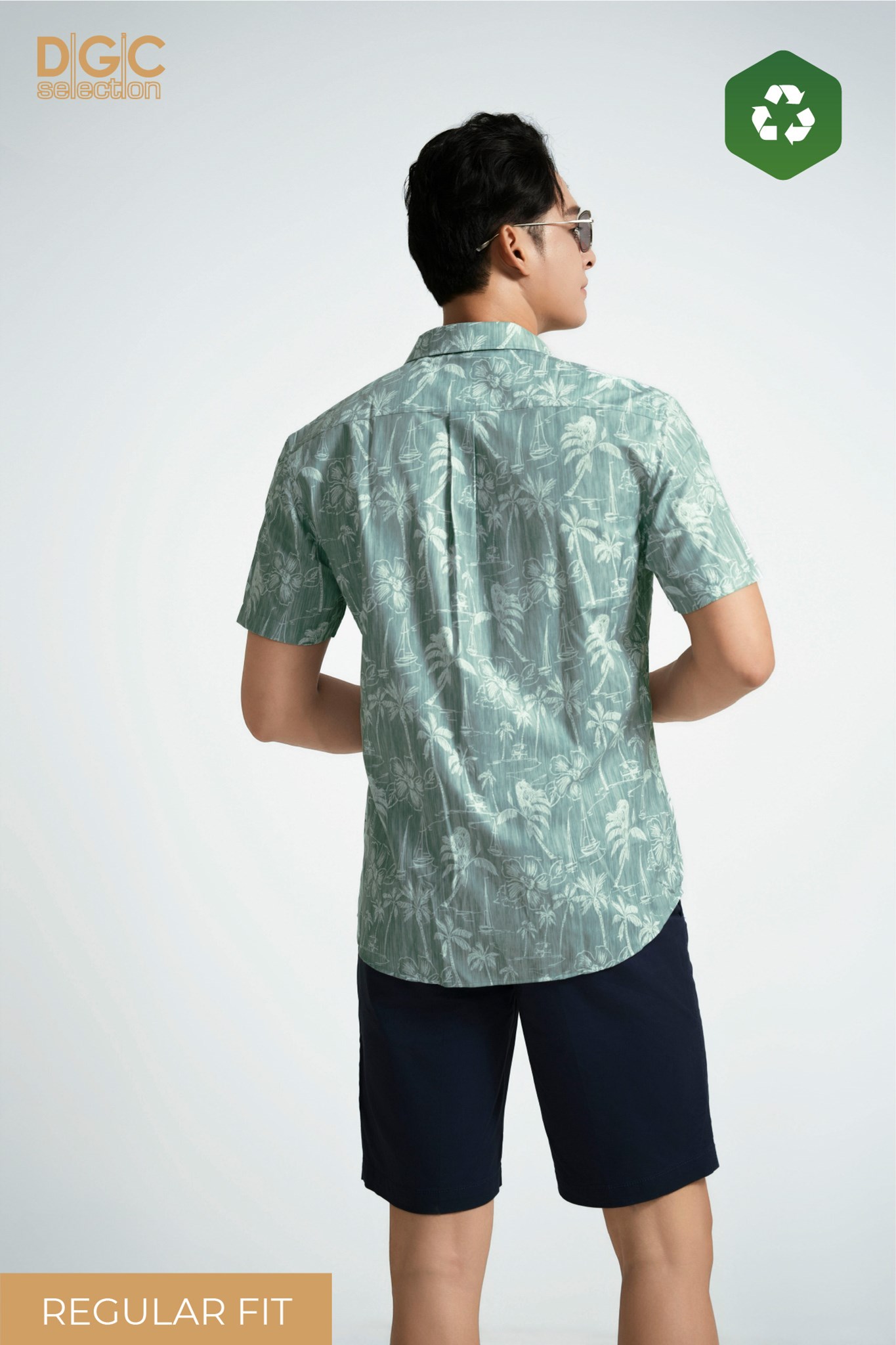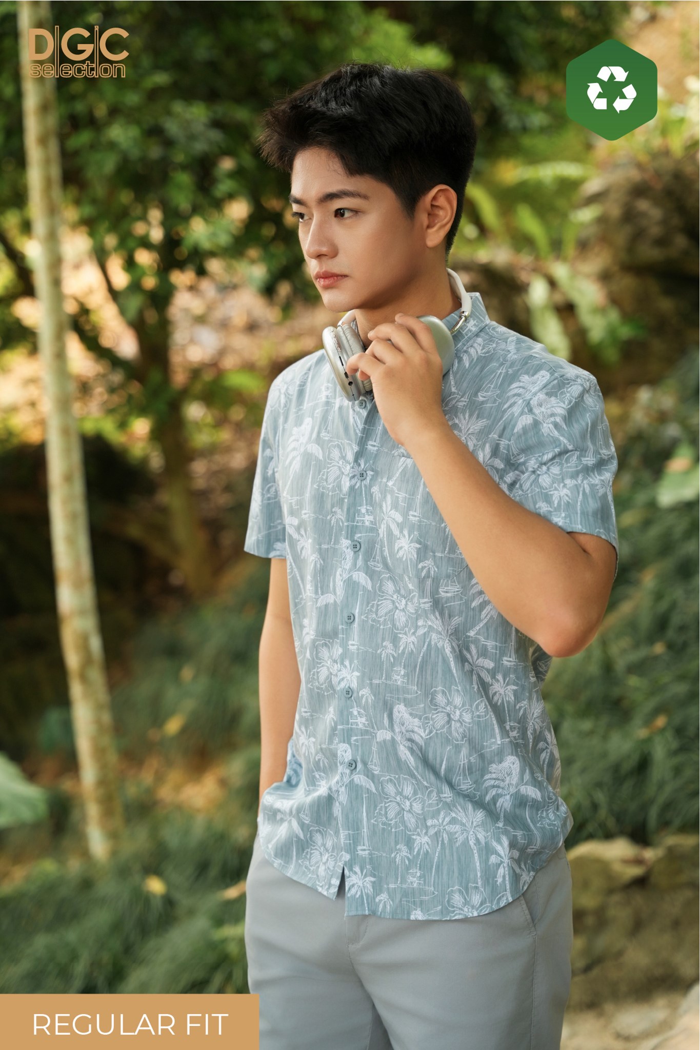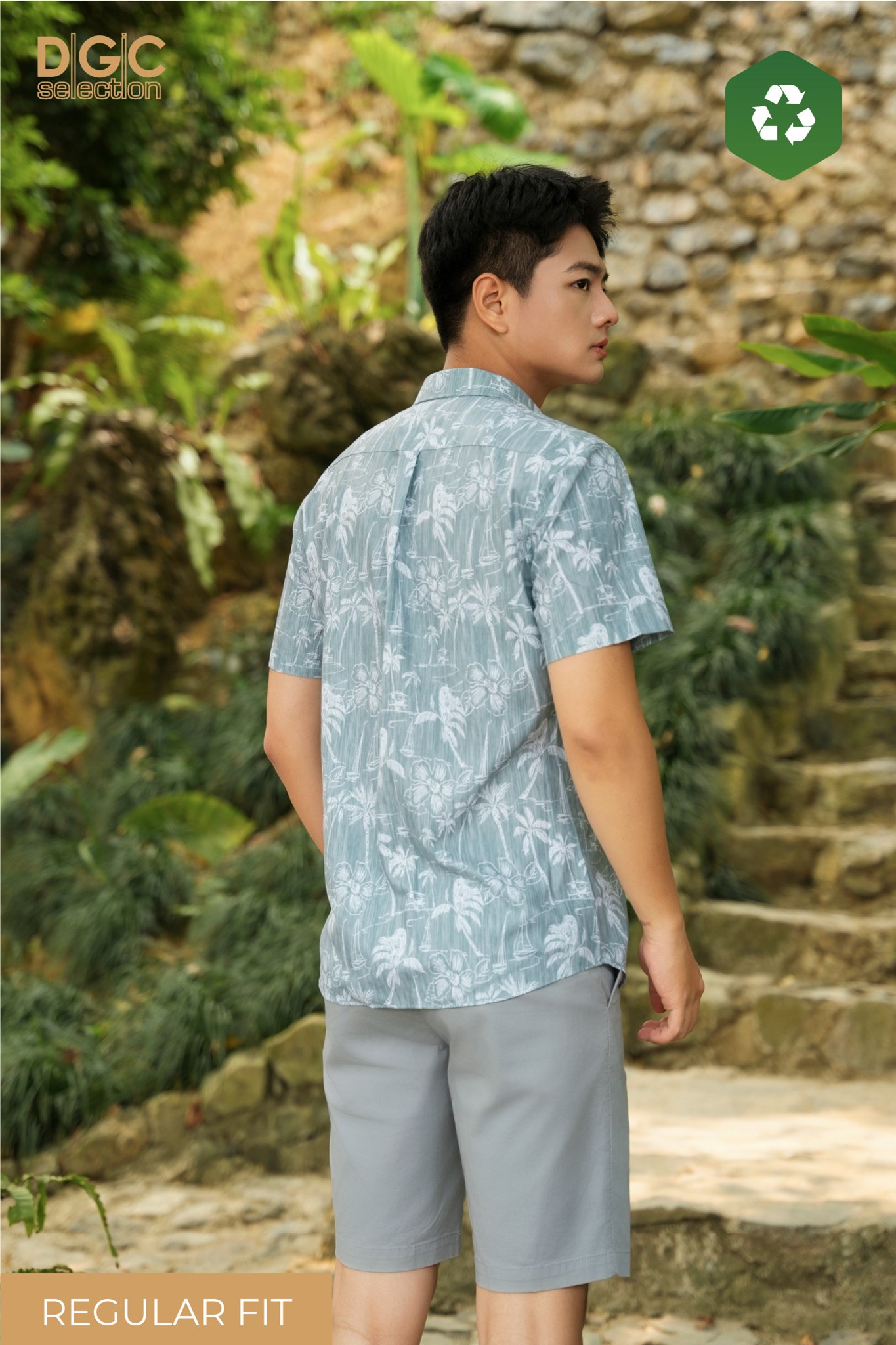 - Kiểu dáng: Sơ mi ngắn tay họa tiết dáng suông vạt lượn, túi ngực trái, tay áo suông, nẹp áo liền, ly súp thân sau