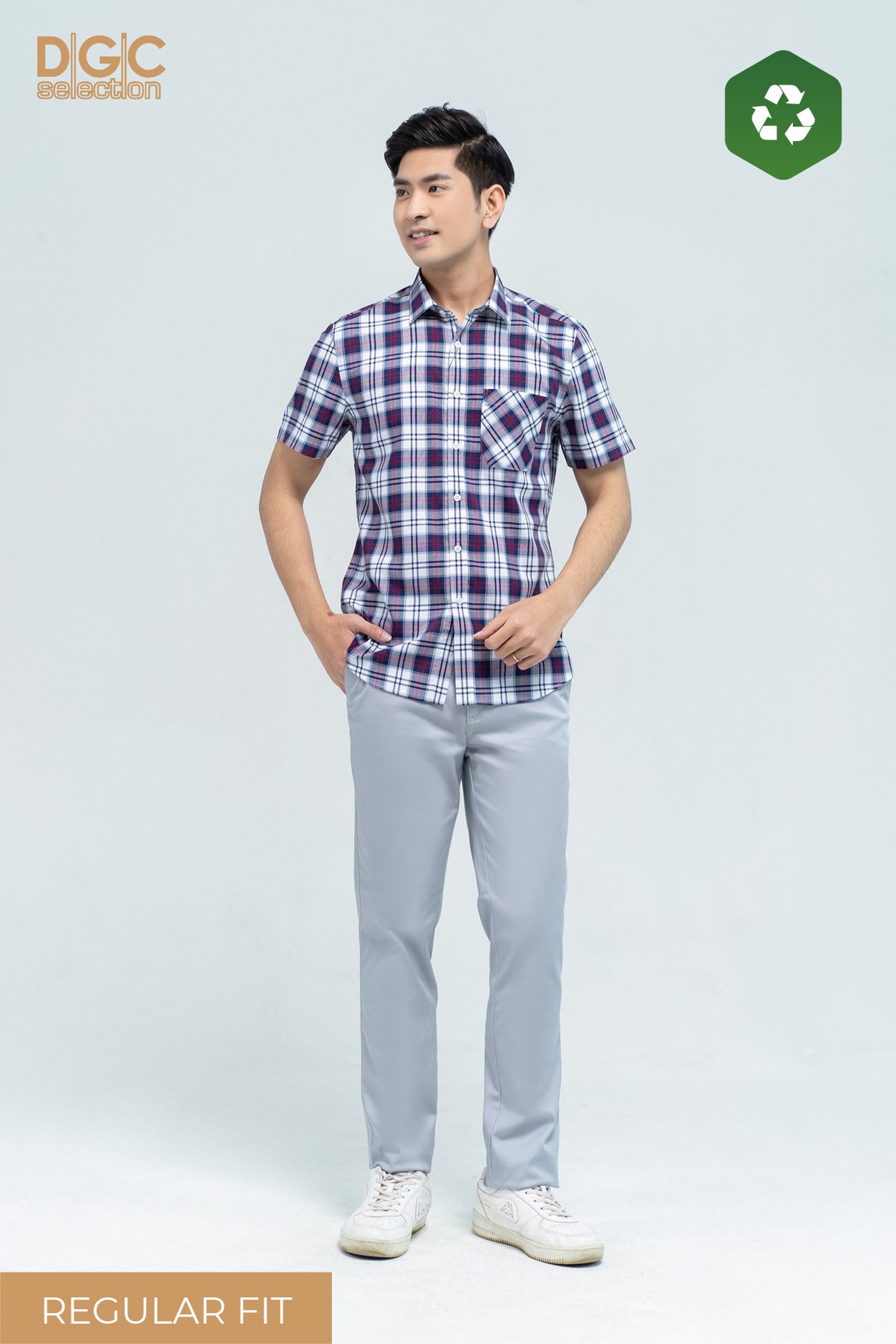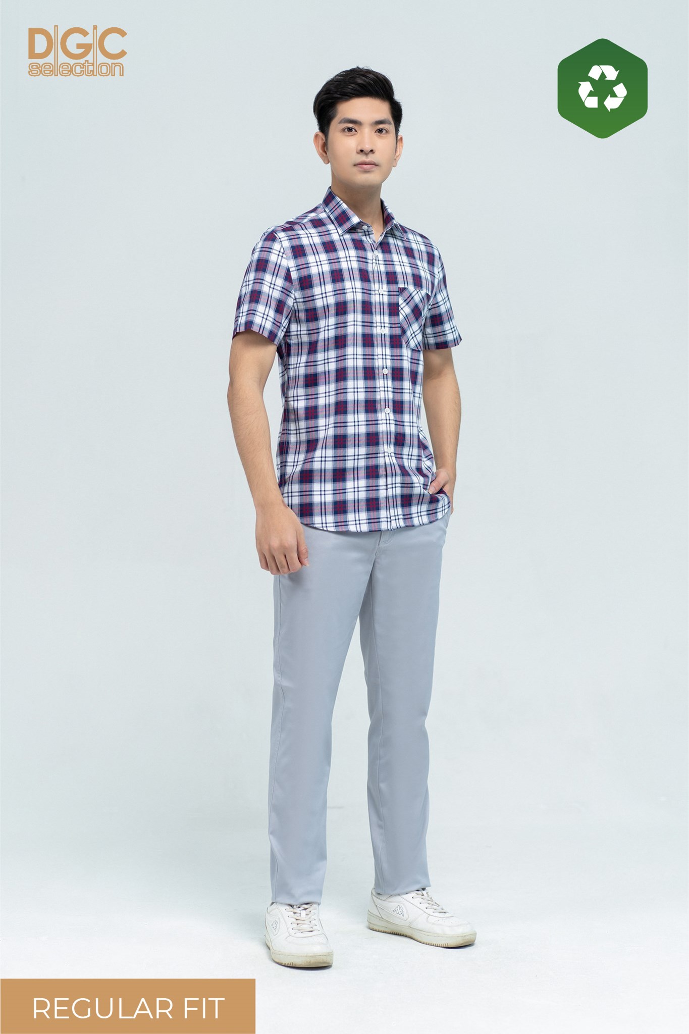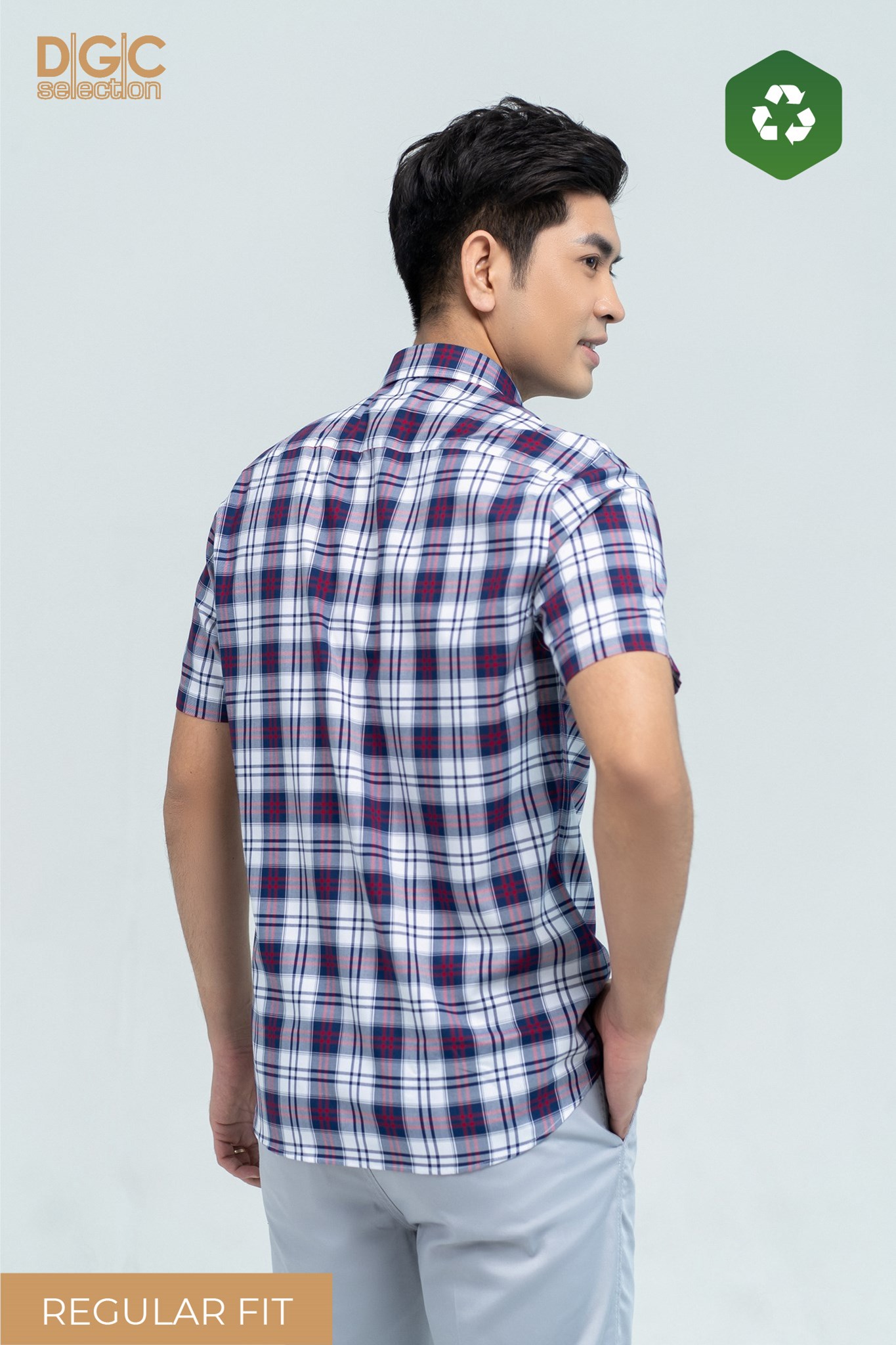- Kiểu dáng: Sơ mi ngắn tay dáng suông (regular fit), cầu vai trong và túi áo cắt chéo
