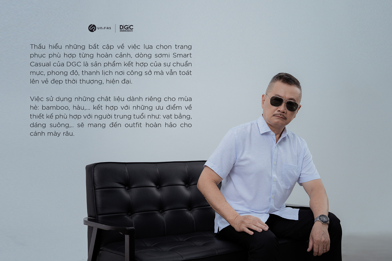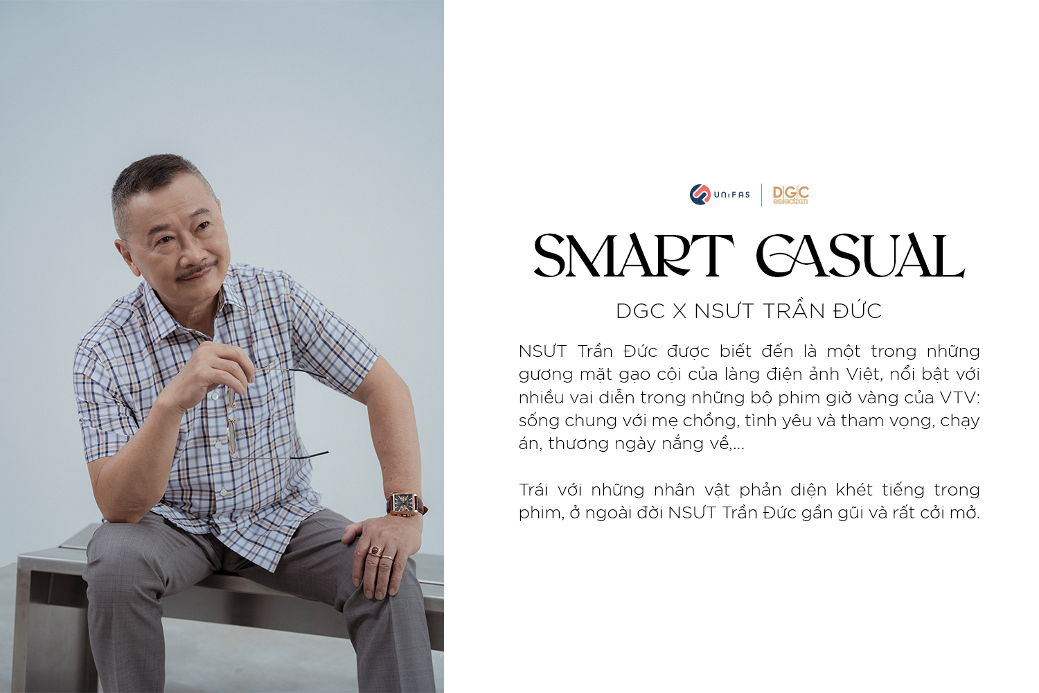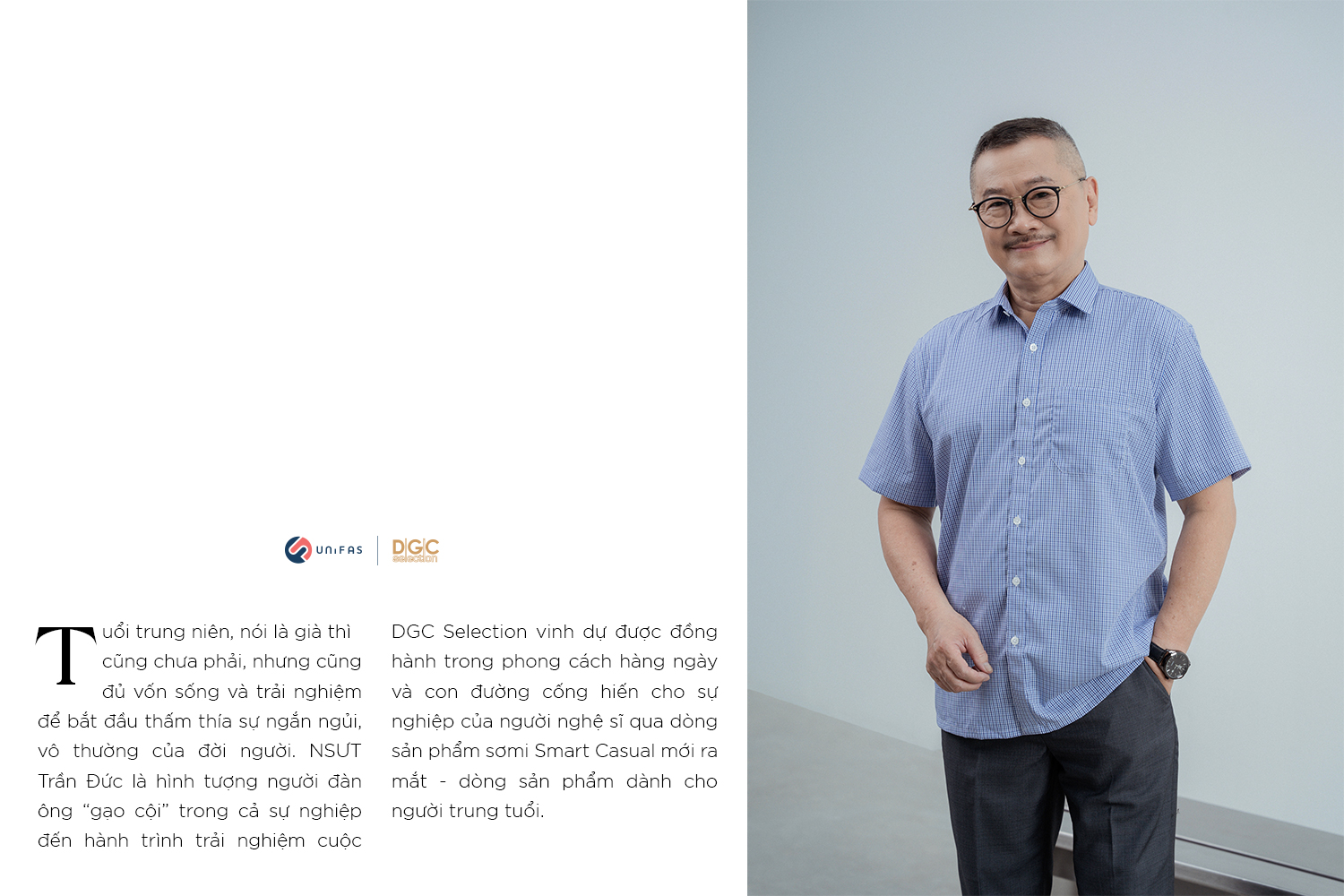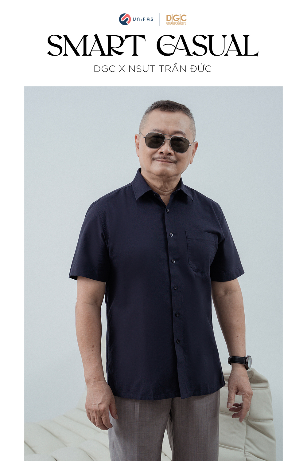DGC vinh dự được hợp tác cùng NSƯT Trần Đức đưa dòng sản phẩm sơmi dành riêng cho người trung tuổi - Smart Casual ra mắt khách hàng qua những hình ảnh lịch lãm, phong độ của người nghệ sĩ quen thuộc.