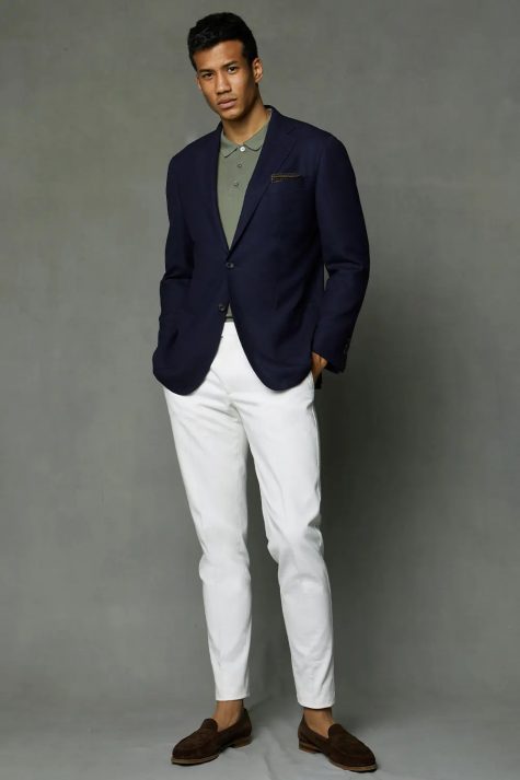 Sự vừa vặn luôn là yếu tố quan trọng, đặc biệt là khi nói đến các trang phục may đo. Áo polo phải vừa vặn để mặc cùng blazer mà không bị nhăn. Bên cạnh đó, các đường may phải thẳng hàng hoàn hảo với phần vai.